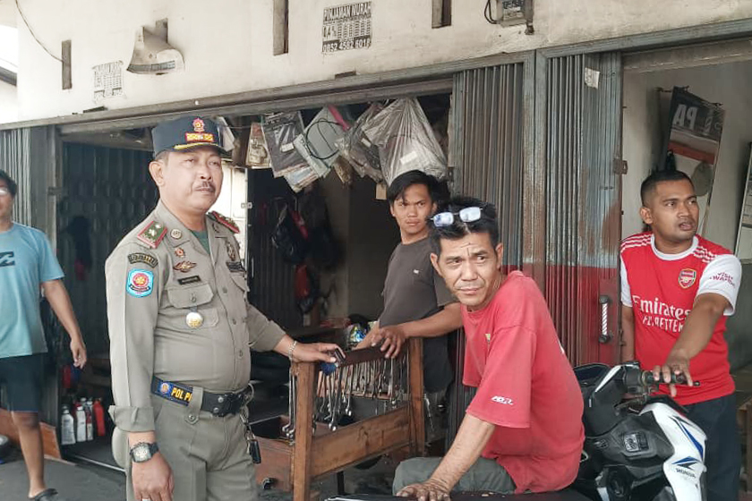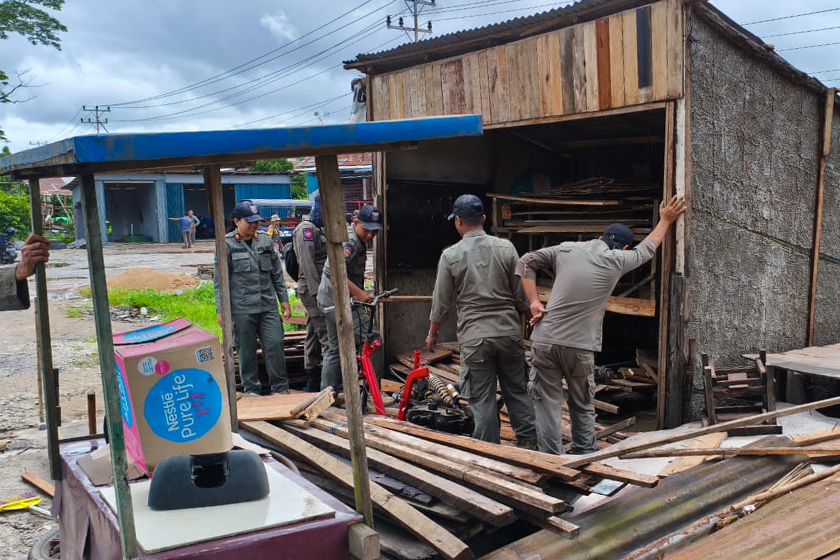 Kepala Seksi Ketentraman, Ketertiban dan Perlindungan Masyarakat Kec. Sungai Raya Bapak Nur Alamsyah bersama anggota Satpol PP Kec. Sungai Raya meninjau lokasi penataan pedagang kaki lima atau bangunan/kios yang berada di atas saluran air di Desa Arang Limbung (depan panti jompo - Gg. Mutiara), Kegi . . .
