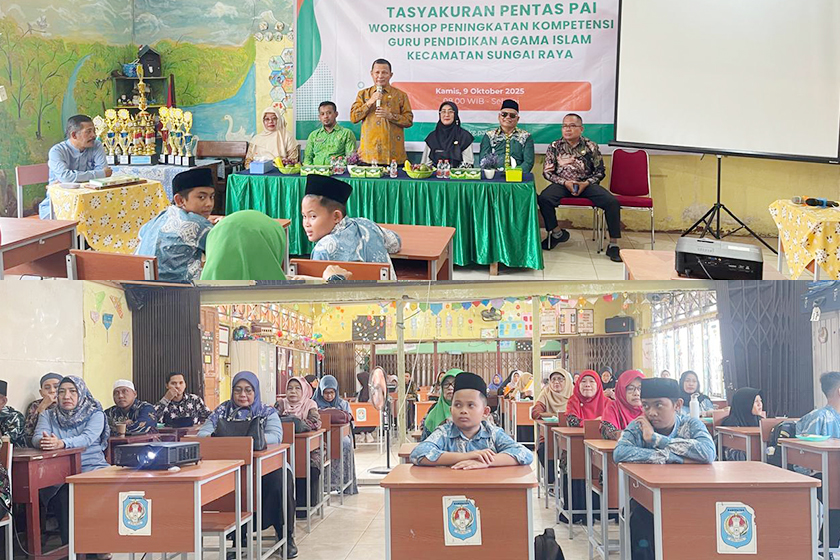 Camat Sungai Raya Bapak Drs. M. Ikhsan Sukendra, M.Si didampingi Plt. Kepala Seksi Kesejahteraan Rakyat Ibu Purwanti, A.Md menghadiri Tasyakuran Pentas PAI Workshop Peningkatan Kompetensi Guru Pendidikan Agama Islam Kecamatan Sungai Raya, kegiatan ini dilaksanakan pada hari Kamis, 09 Oktober 2025 di SDN 07 Sungai Raya.