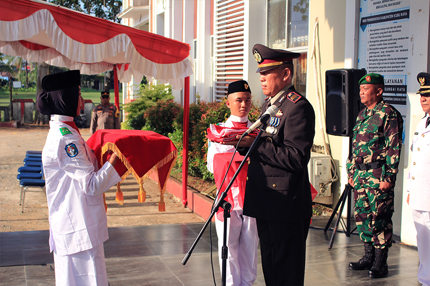 Kepala Kepolisian Sektor Sungai Raya Bapak AKP. Hariyanto, S.Sos., M.H. bertindak sebagai Inspektur Upacara, dihadiri juga oleh Camat Sungai Raya, Danramil Sungai Raya, Ketua TP PKK Kecamatan Sungai Raya dan tamu undangan lainnya.